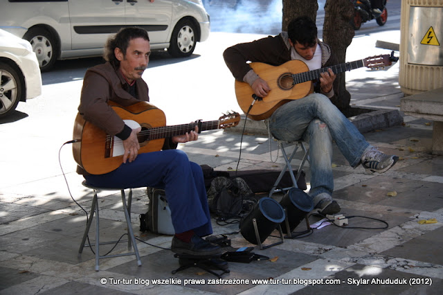 Gitarzyści flamenco przygrywają do obiadu na plaza Nueva w Granadzie